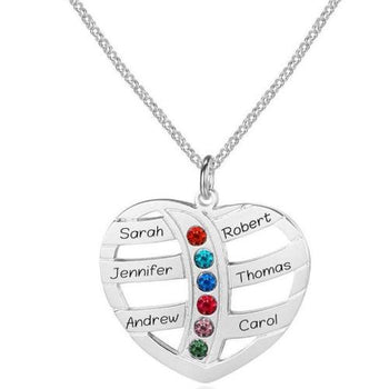 - 6 Birthstone Silver Heart Mother's Necklace 6 Engraved Names