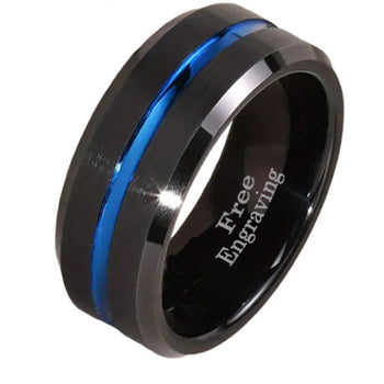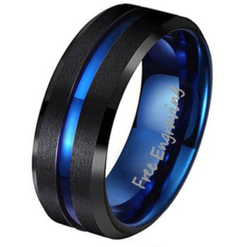- Personalized Men's Wedding Ring Band - Black and Blue Line Groove