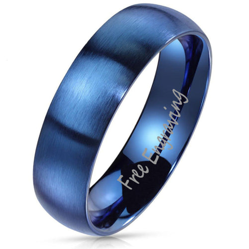 This comfort fit engraved stainless steel wedding band for him features a dome band design and blue coating.