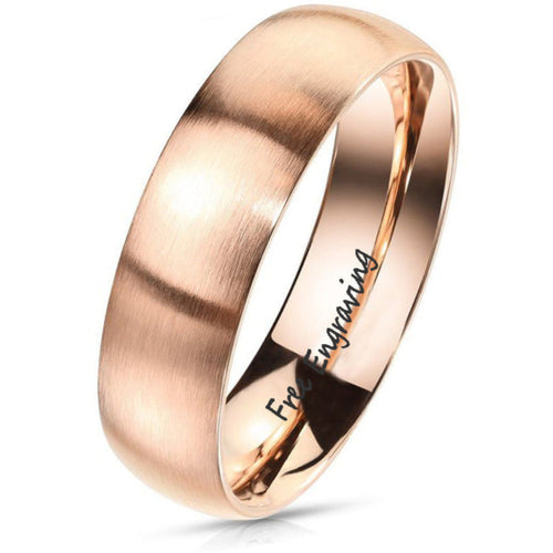 This comfort fit promise ring features a dome design of 18k rose gold over stainless steel.