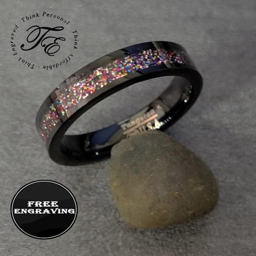 This comfort fit promise ring features red and purple galaxy opal inlays in the outer band.