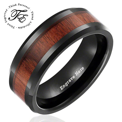 This comfort fit wedding band features a black band with wood inlay in the outer band.