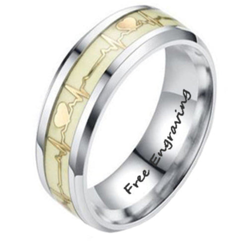 This comfort fit promise ring features a metal heartbeat on the outer band that will glow in the dark.