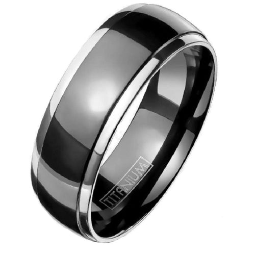 This comfort fit Titanium wedding band for him features a black band with silver beveled edges.