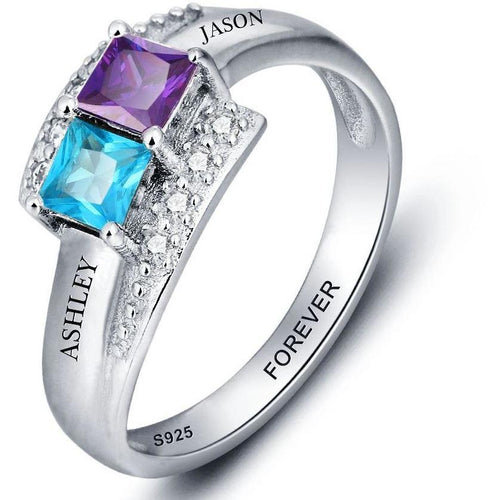 You can make this ring personalized with your choice of 2 birthstones, 2 names and a special inner ring message. Please note names must be 9 characters or less and the inner ring engraving must be 20 characters or less.