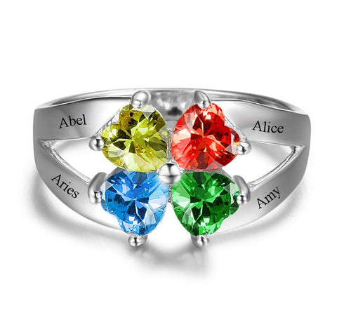 4 Heart Birthstone Mother's Ring .925 Sterling Hearts Together 4 Names