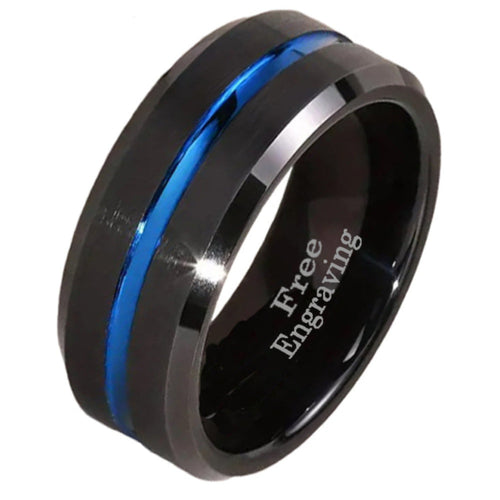 This comfort fit promise ring features a black beveled Tungsten band with a blue line groove on the outer band.