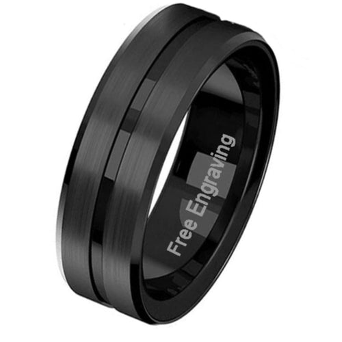 This comfort fit Tungsten wedding band for men features beveled edges and a center groove on the matte black outer band.