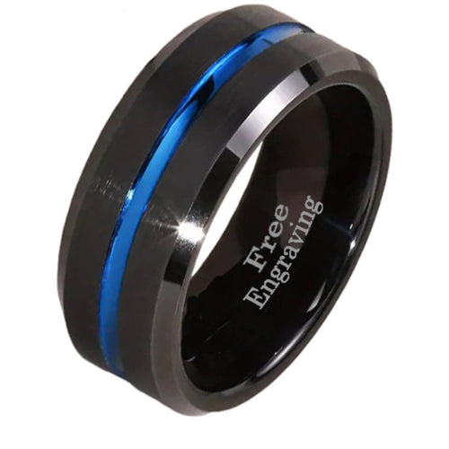 This comfort-fit Tungsten promise ring for men features a black Tungsten band with a grooved blue line outer band.