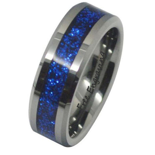 This comfort-fit Tungsten promise ring for men features a blue galaxy fire opal that gives this engraved promise ring a unique look.