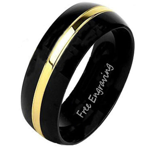 This comfort fit engraved Titanium wedding band for him features a dome band design with a center groove in the outer band cover in 14k gold.