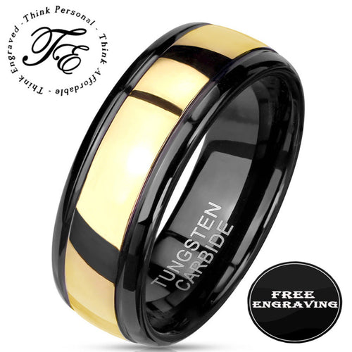 This comfort fit Tungsten promise ring for him features a black inner band and 14k gold over Tungsten outer band. This gives this traditional style designed ring a little more character.