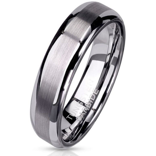 This comfort fit Tungsten wedding band ring for men features a beveled brushed steel design.