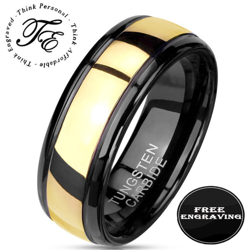 This comfort fit engraved Tungsten wedding band for him features a black inner band and 14k gold over Tungsten outer band.
