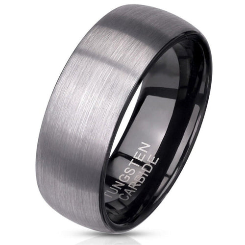 This comfort fit engraved Tungsten wedding band features a black inner band and brushed steel outer band.