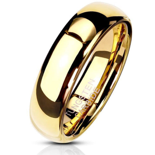 This comfort fit engraved wedding band for men features 18k gold over Tungsten with a domed out band.