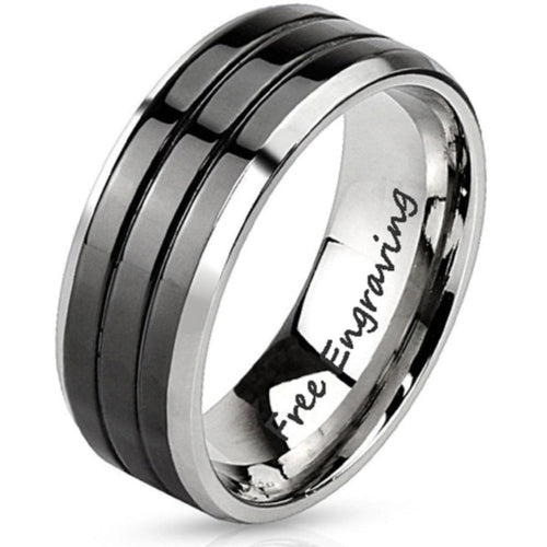 This comfort fit engraved wedding band for men features a silver band with a double grooved outer band.