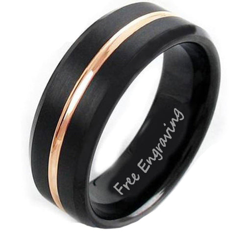 This comfort-fit Tungsten wedding band for men features a black Tungsten band with a center gold line groove.