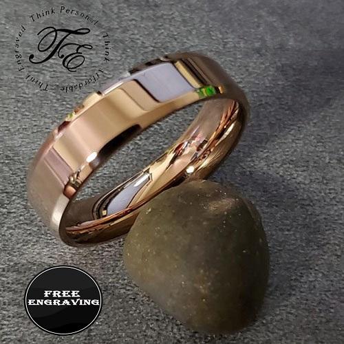 This comfort fit engraved promise ring for women features beveled edges and 14k rose gold over 316 stainless steel