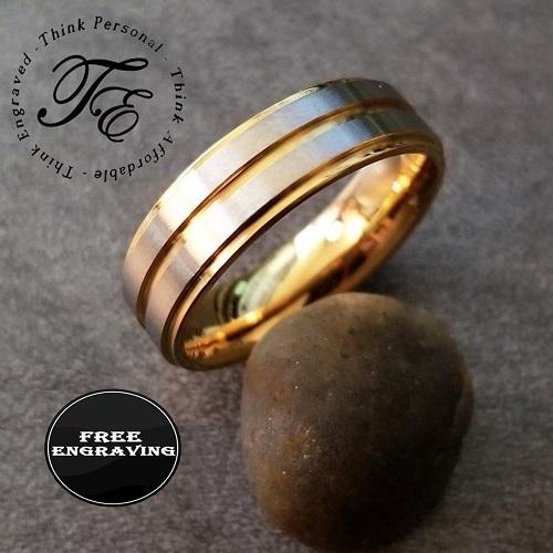This comfort fit engraved promise ring for her features a 14k gold over stainless steel band with a center groove on the outer band between brushed steel accents.