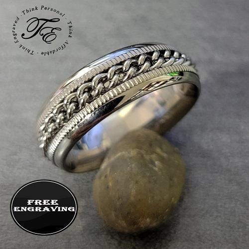 This comfort fit promise ring for girls features a silver beveled band with a silver chain spinner/