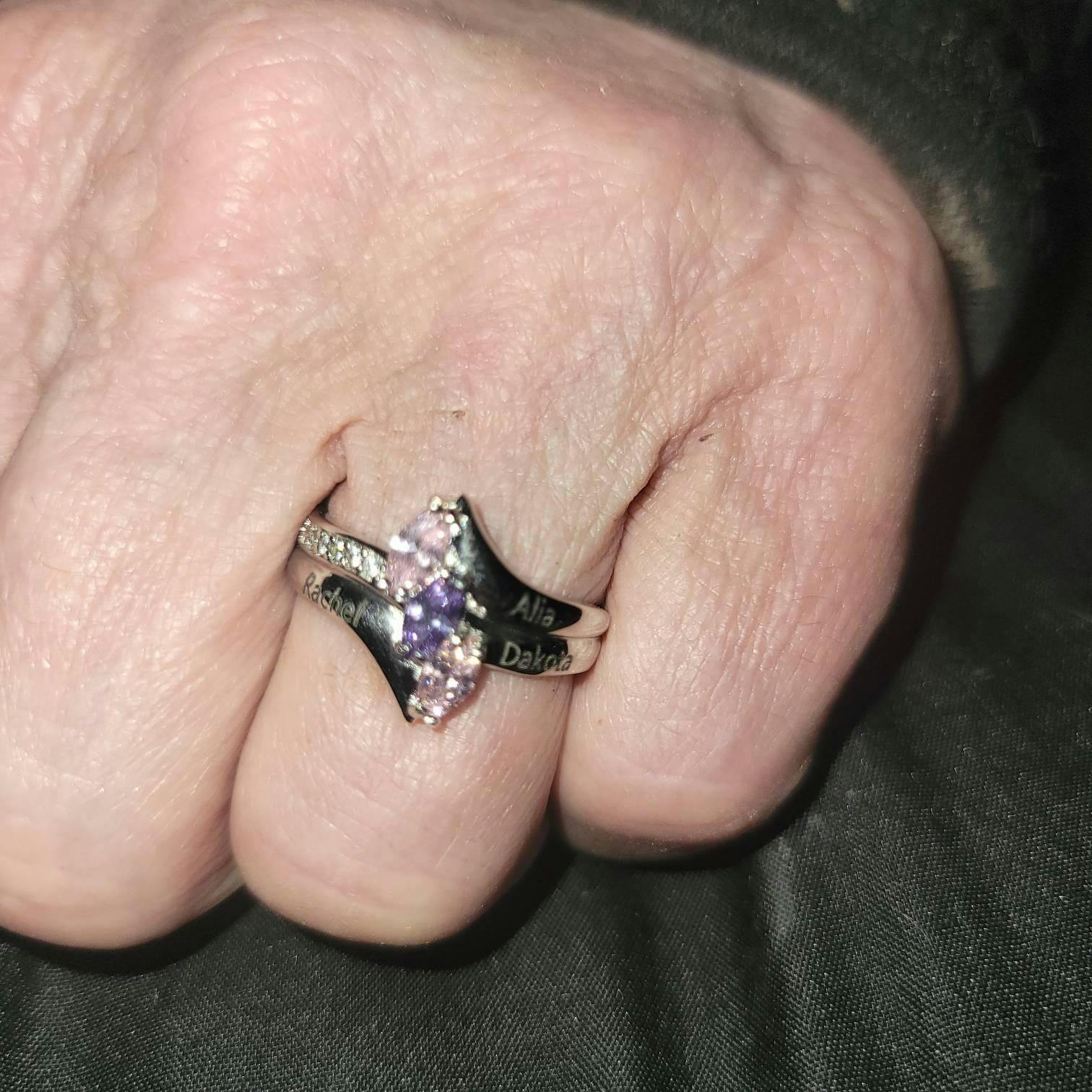 Make this ring personalized with your choice of 3 birthstones, 3 engraved namesย and a special inner ring message. Please note names must be 9 characters or less and the inner ring engraving must be 20 characters or less.