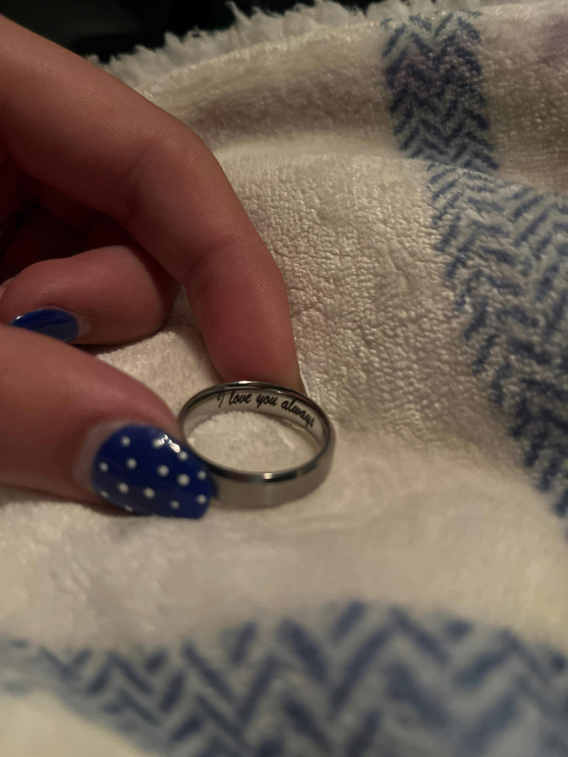 This ring is an 11 out of 10. It is somehow more than perfect. The etching is impeccable and the ring is beautiful. It fits perfectly and feels so comfortable I don’t even remember it’s there. The ordering was super simple and I couldn’t believe how fast it was made and shipped (especially for a custom item!) I will definitely buy from this seller again and I would recommend anyone on the fence or have something in their cart from this seller to buy. You won’t be disappointed.